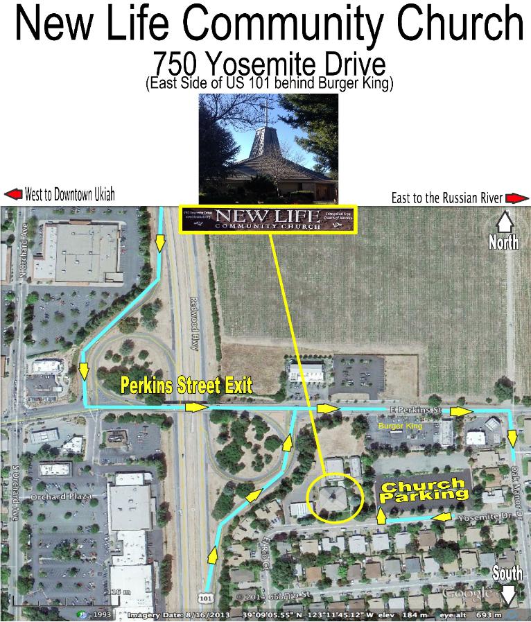From the South (Santa Rosa, San Francisco and all points South). - Take Highway 101 North. - Once in the Valley of Ukiah Get off Highway 101 at the Perkins Street Exit. (Exit number 549) - Turn right on Perkins Street. - Turn right, on Oak Manor Drive (at the gas station, past Burger King). - Turn Right on Yosemite Drive (first right off of Oak Manor Drive). - The Church is on your right.